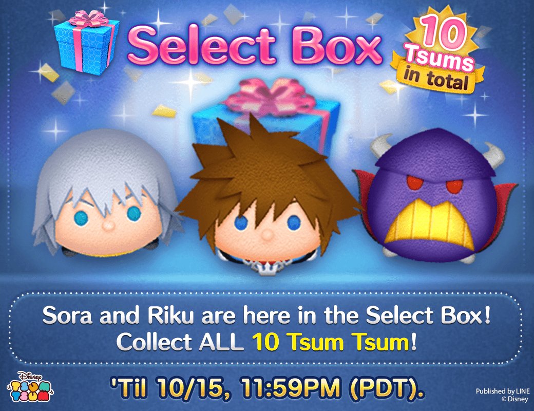 ¡Los Tsum Tsum de Sora y Riku están disponibles de manera limitada en el título "LINE: Disney Tsum Tsum"! Pueden conseguirse en las "Cajas Selectas" con una probabilidad del 10% cada uno hasta las 8:59 (hora española) del 16 de octubre: ![]()